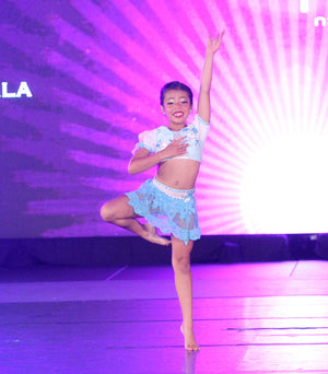 This adult small costume is made from printed holographic fabric and accented with peacock blue mesh. The unique, open back is accented with mystique blue rhinestoned straps. The matching hair accessory is included. Leg bands provide a secure and full coverage brief. It is embellished with a beaded applique and 4 colors of swarovski rhinestones in multiple sizes.